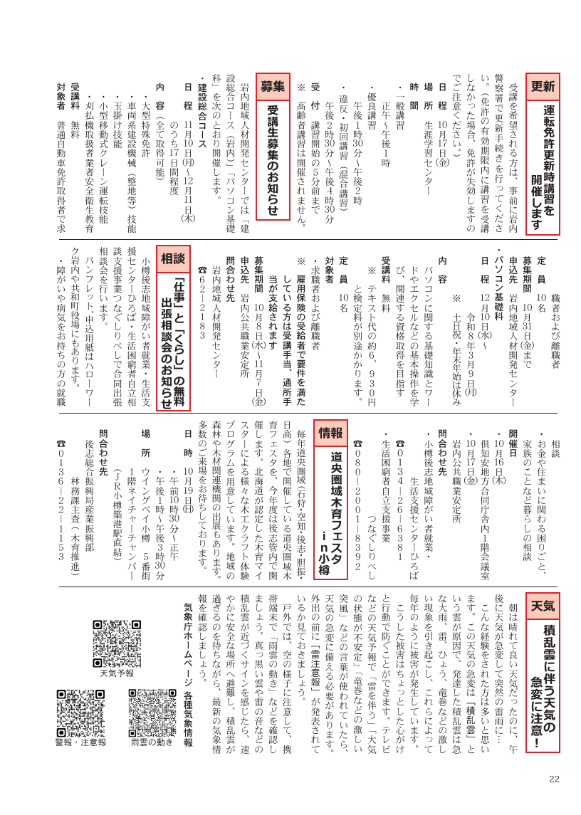 くらし 広報きょうわ 2025年10月号 P.22 22/26 前の記事 次の記事 発行日 : 2025年10月01日 自治体名 : 北海道共和町 広報紙名 : 広報きょうわ 2025年10月号(No.842) Tweet シェアする 広報きょうわ 2025年10月号 P.21 広報きょうわ 2025年10月号 P.23