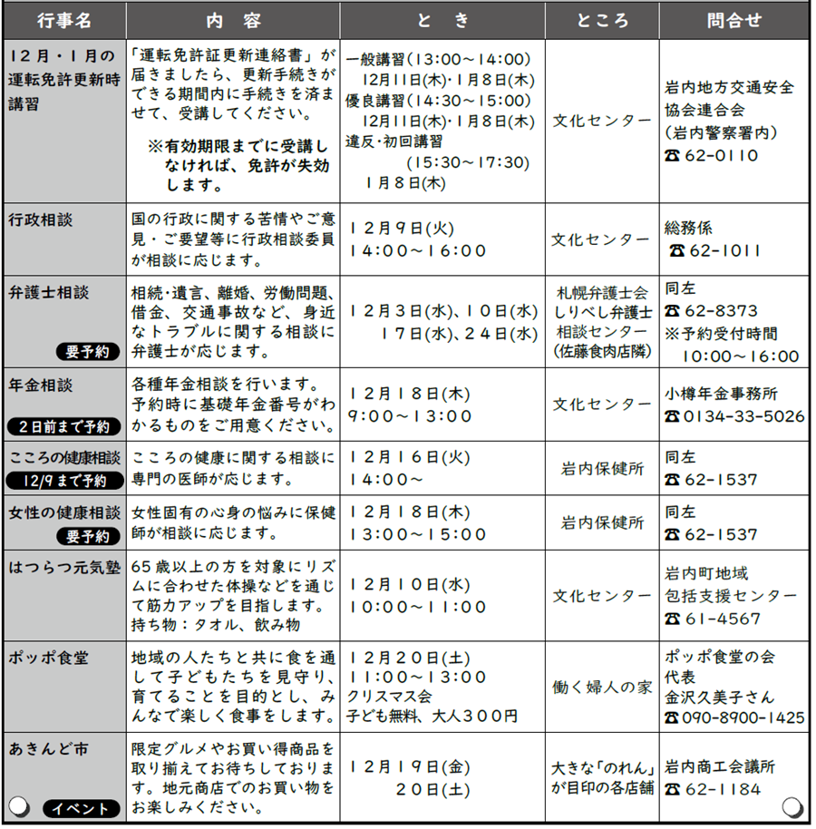 くらし 12月講習・相談・催しのご案内 13/25 前の記事 次の記事 発行日 : 2025年12月01日 自治体名 : 北海道岩内町 広報紙名 : 広報いわない 2025年12月号 相談料は無料です。 どなたでもお気軽にご相談ください。 Tweet シェアする ロードヒーティングの停止 母子健康包括支援センターand保健センターガイド