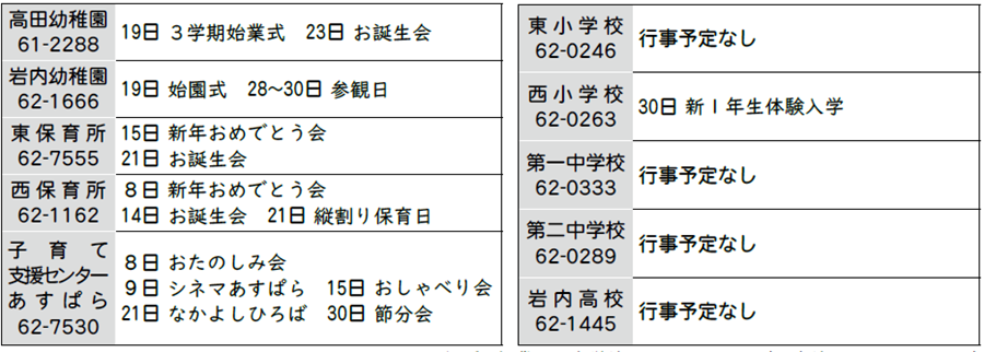 子育て 幼稚園・保育所・学校 情報 1月 17/25 前の記事 次の記事 発行日 : 2026年01月01日 自治体名 : 北海道岩内町 広報紙名 : 広報いわない 2026年1月号 冬季休業 小中学校…1月14日まで 高校…1月13日まで 学校閉庁日 小中学校…1月5日まで 高校…1月3日まで Tweet シェアする みんなおいでよ 絵本館 木田金次郎美術館情報