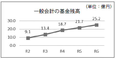 令和6年度は、約1億4,000万円の基金を取り崩しましたが、財政調整基金やまちづくり推進基金などへ約4億9,000万円積立をしたため、一般会計の基金残高は、約3億5,000万円増加しました。