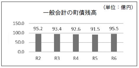 一般会計の町債残高は、毎年徐々に減少していましたが、令和6年度では、義務教育学校の整備などにあてるため、約13億7,000万円の町債を発行した影響で、借入額が償還額を上回り、前年度と比べて約4億円増加しました。