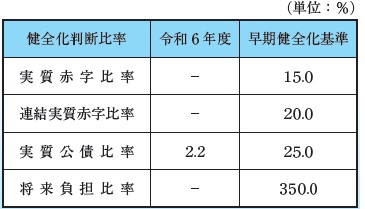 健全化判断比率(実質赤字比率、連結実質赤字比率、実質公債費比率、及び将来負担比率)および資金不足比率は、いずれも健全段階です。