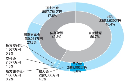 そこで、村民の皆様に納めていただいた税金や国・道からの補助金などの依存財源の状況を図表でお知らせいたします。