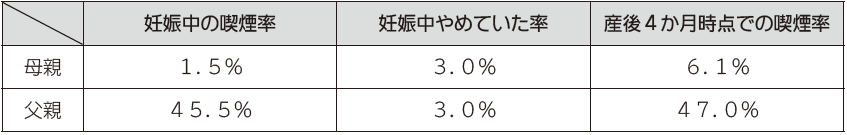 母親に比べ父親の喫煙率は高くなっています。また妊娠中にたばこをやめていた割合も低く、パートナーの妊娠をきっかけに禁煙に繋がるケースは少ないと考えられます。
