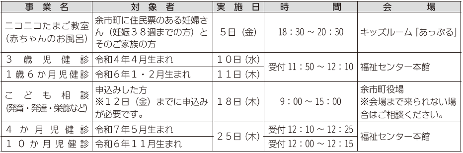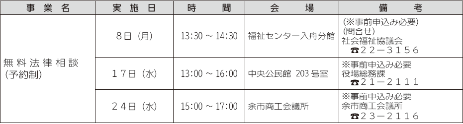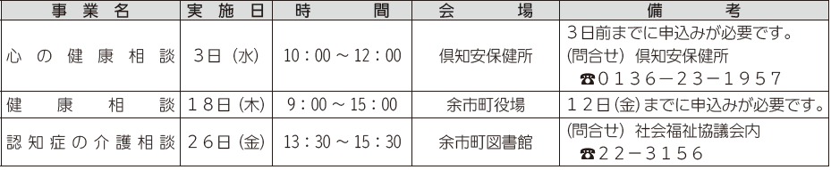 ※福祉センター本館(富沢町5丁目)、福祉センター入舟分館(入舟町)、中央公民館(大川町4丁目)、倶知安保健所余市支所(朝日町)、余市商工会議所(黒川町3丁目)