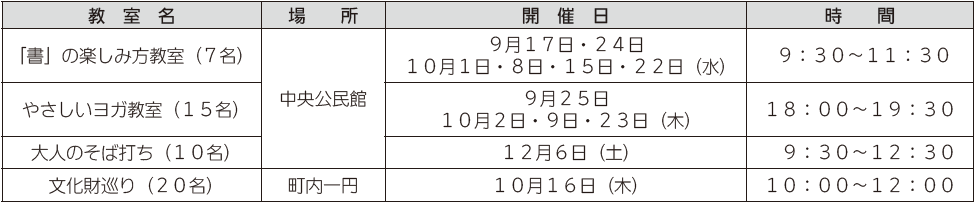 講座 生涯学習だより 23/36 前の記事 次の記事 発行日 : 2025年09月01日 自治体名 : 北海道余市町 広報紙名 : 広報よいち 令和7年9月号 ■健康・生涯スポーツ教室(参加無料) ■公民館文化教室(教材費・材料費は自己負担) ■森林浴ハイキング(参加費1,000円) ※申込受付開始は9月1日(月)から。定員になり次第締め切りとなります。(受付は平日のみ9:00~) 問合せ:公民館 【電話】23-5001 Tweet シェアする 児童館行事案内 寿大学・女性学級の皆さんへ(今月の学習内容)