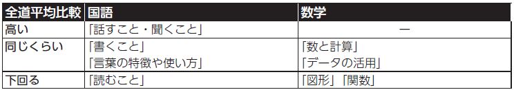 国語:全般的には多少全国より低くなっています。分野別では「書くこと」「情報の扱い」に関してが苦手です。