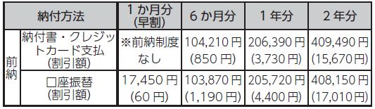 前納は下の表「当月末振替(早割)」「6か月前納」「1年前納」「2年前納」の4種類から自由に選んで申し込むことができます。
