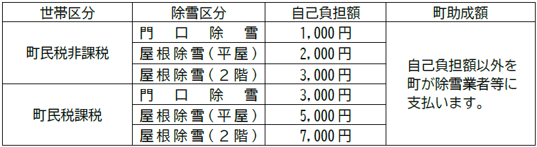 町では災害時の避難口確保のため、自力で除雪することができない下記の世帯に対して、門口や屋根の除雪費用の一部を助成いたします。