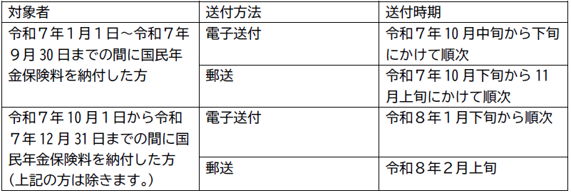 日本年金機構から「社会保険料(国民年金保険料)控除証明書」が対象の方に送付されます。お手元に届きましたら、大切に保管し、年末調整や確定申告の際に使用してください。