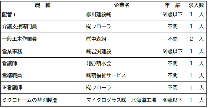 ※詳細につきましてはハローワーク砂川(【電話】54-3147)またはハローワークインターネットサービス(https://www.hellowork.go.jp/index.html)の「求人情報検索」でご確認ください。