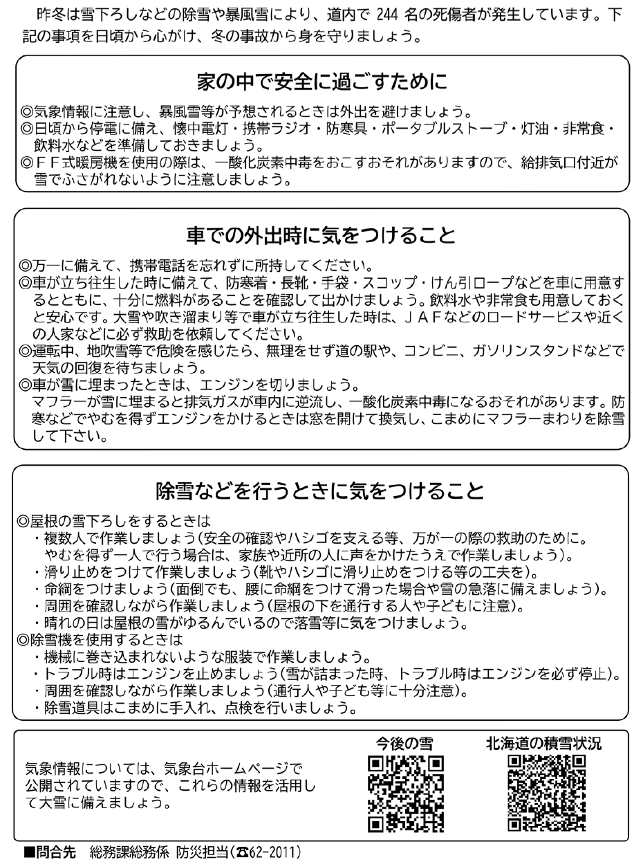 くらし 本格的な冬の到来に伴う被害防止について 10/40 前の記事 次の記事 発行日 : 2026年01月01日 自治体名 : 北海道上砂川町 広報紙名 : 広報かみすながわ 2026年1月号 Tweet シェアする 水道管の凍結に注意しましょう 「国保特定健康診査」の受診お忘れではありませんか?