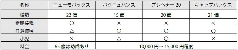肺炎は高齢者にとって命に関わることもある病気です。原因のひとつである「肺炎球菌」は、65歳以上で特に重症化しやすく、予防のためのワクチン接種が大切です。日本では、65歳のときにニューモバックス(23価肺炎球菌ワクチン)を定期接種として、費用の助成を受けて接種することができます。ただし、よりしっかりと免疫を得るためには、次のように組み合わせて接種することが有効とされています。