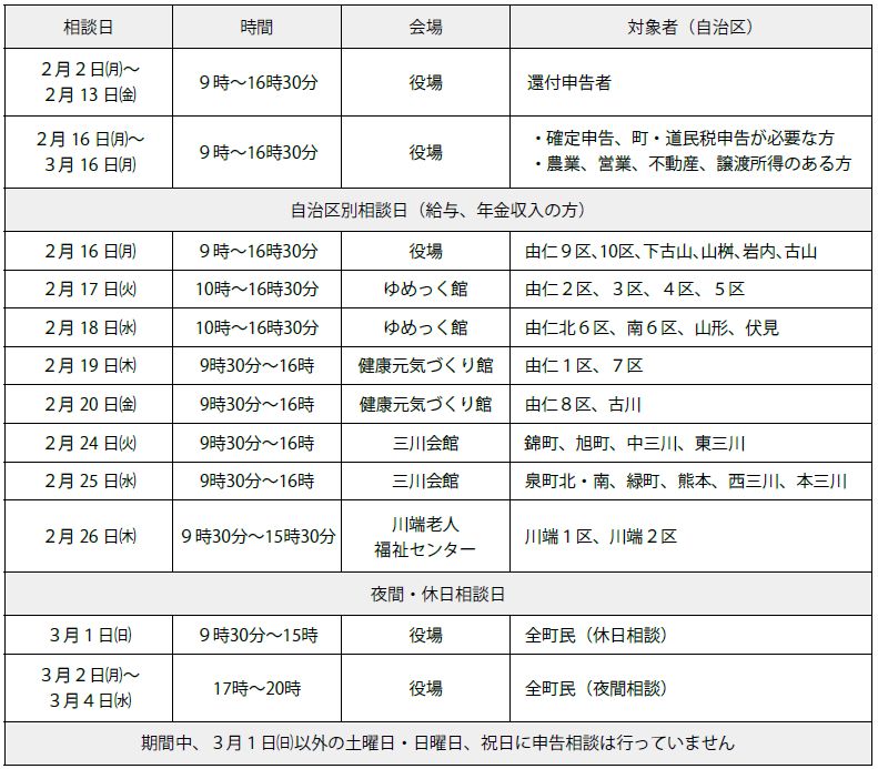 令和7年分所得税の確定申告、令和8年度町・道民税の申告を別表のとおり受け付けます。代理の方でも申告できます。