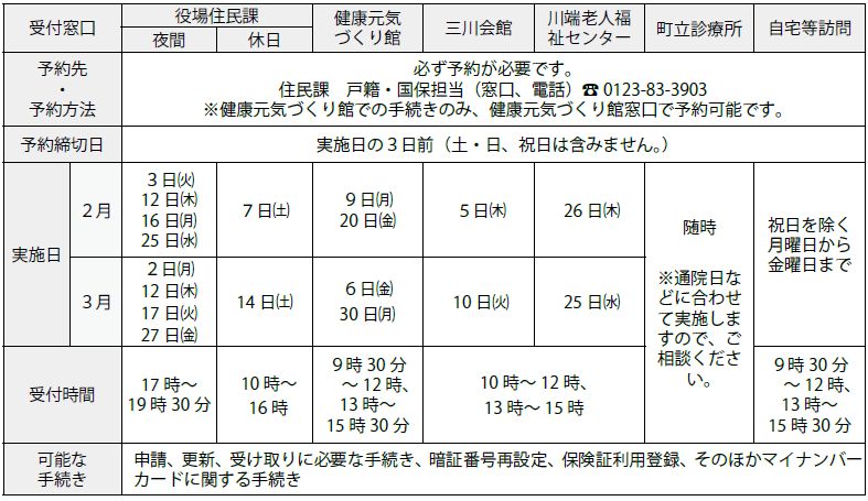 くらし マイナンバーカード手続き 9/18 前の記事 次の記事 発行日 : 2026年02月01日 自治体名 : 北海道由仁町 広報紙名 : 広報ゆに 2026年2月号 役場住民課の窓口では、平日8時30分から17時まで、予約なしで手続きができます。 その他の日時や役場以外での手続きは次のとおりです。 問合せ:住民課戸籍・国保担当 【電話】0123-83-3903 Tweet シェアする 暮らしの情報(2) 国民年金情報
