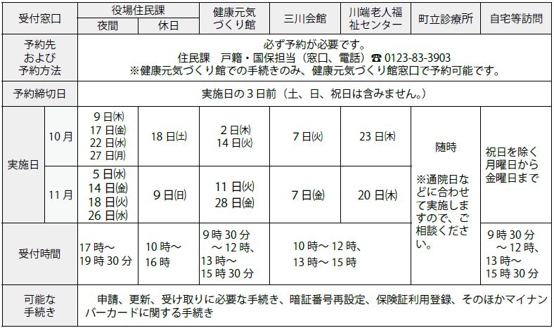 くらし マイナンバーカード手続き 11/24 前の記事 次の記事 発行日 : 2025年10月01日 自治体名 : 北海道由仁町 広報紙名 : 広報ゆに 2025年10月号 役場住民課の窓口では、平日8時30分から17時まで、予約なしで手続きができます。 その他の日時や役場以外での手続きは次のとおりです。 問合せ:住民課戸籍・国保担当 【電話】0123-83-3903 Tweet シェアする 定額減税補足給付金(不足額給付金) マイナンバーカード有効期限と更新手続き