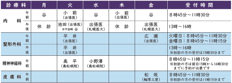 ※11月19日(水)、21日(金)、26日(水)、28日(金)の内科診療は、谷医師から出張医に変更します。
