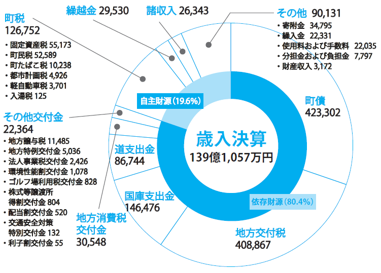 歳入全体の構成は町税や使用料など、町が独自に確保している自主財源の割合が19.6%、地方交付税や国・道からの交付金などの依存財源の割合が80.4%となりました。