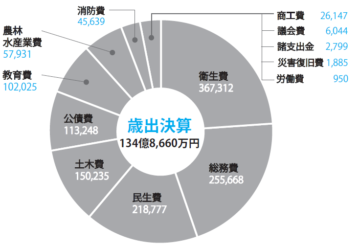 歳出全体の構成は、衛生費が最も多く、次に総務費、民生費となっています。