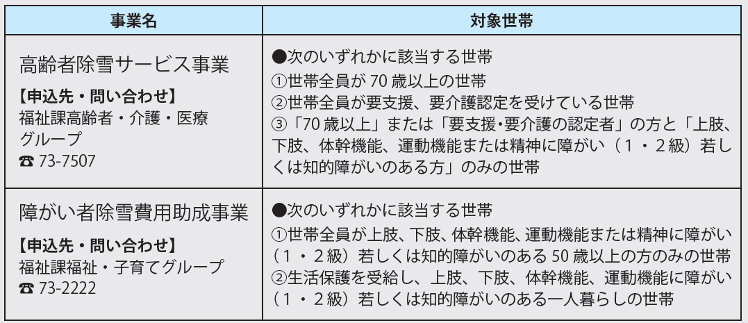 サービス内容:自宅周辺で自らが行えない範囲の除雪や排雪、屋根の雪下ろしに対する費用を助成