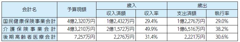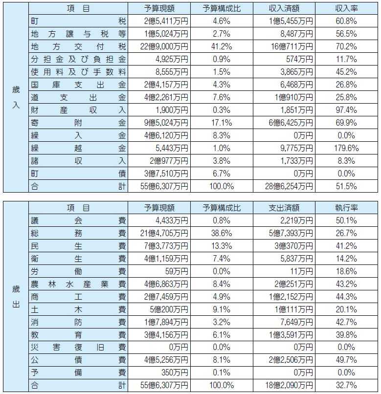 一般会計の歳入は、予算額に対し、上半期収入が28億6,254万円で収入率51.5%。歳出は、予算額に対し、上半期支出が18億2,090万円の執行率32.7%となっております。