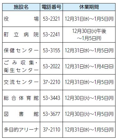 年末年始にあたり、町内各公共施設の休業期間は次のとおりとなります。