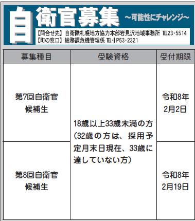 しごと 自衛官募集 8/26 前の記事 次の記事 発行日 : 2026年01月01日 自治体名 : 北海道月形町 広報紙名 : 広報花の里つきがた 令和8年1月号(702号) Tweet シェアする まちのお知らせ 2月7日は北方領土の日です