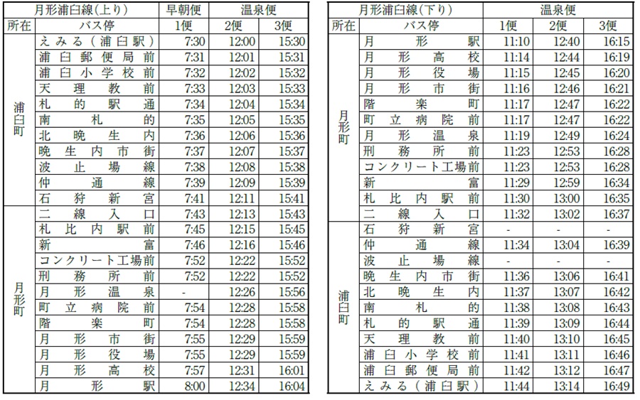 令和7年10月より月形浦臼線の土日祝日便が変更になりました。変更した運行ダイヤは、1日3便へ減便となります。