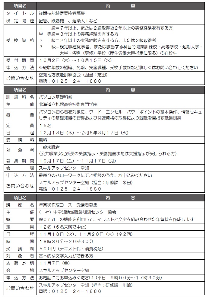 講座 スキルアップセンター空知 技能検定受検者・公共職業訓練生・講座受講者募集 14/25 前の記事 次の記事 発行日 : 2025年10月01日 自治体名 : 北海道浦臼町 広報紙名 : 広報うらうす 令和7年10月号(No.733) Tweet シェアする 狩猟期間中における道有林への入林自粛について 新刊図書案内