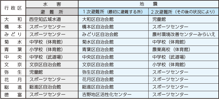 町では、水害と地震が発生した時の避難対象者をそれぞれ想定し、行政区単位で避難所を指定しています。