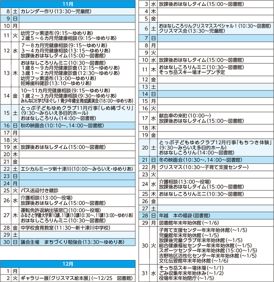 くらし イベントカレンダー(11月8日~12月31日) 17/19 前の記事 次の記事 発行日 : 2025年11月15日 自治体名 : 北海道新十津川町 広報紙名 : 広報しんとつかわ 令和7年11月号 Tweet シェアする 図書館ナビ まちのわだい(9月27日~10月26日)