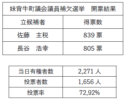 妹背牛町議会議員補欠選挙は8月24日に投開票され、新人で元農協職員の佐藤主税氏(60)-年齢は届け出当時-が初当選を果たしました。