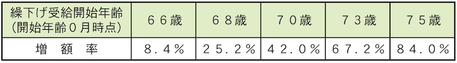 また反対に、65歳で請求せずに66歳以降75歳までの間で申出した時から繰下げて請求することもできます。繰下げた期間によって年金額が増額され、その増額率は一生変わりません。