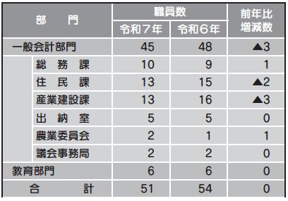 令和7年4月1日現在の職員総数は、次のとおり51人です。(職員数は一般職に属する職員数であり、臨時または非常勤職員を除いた人数です)