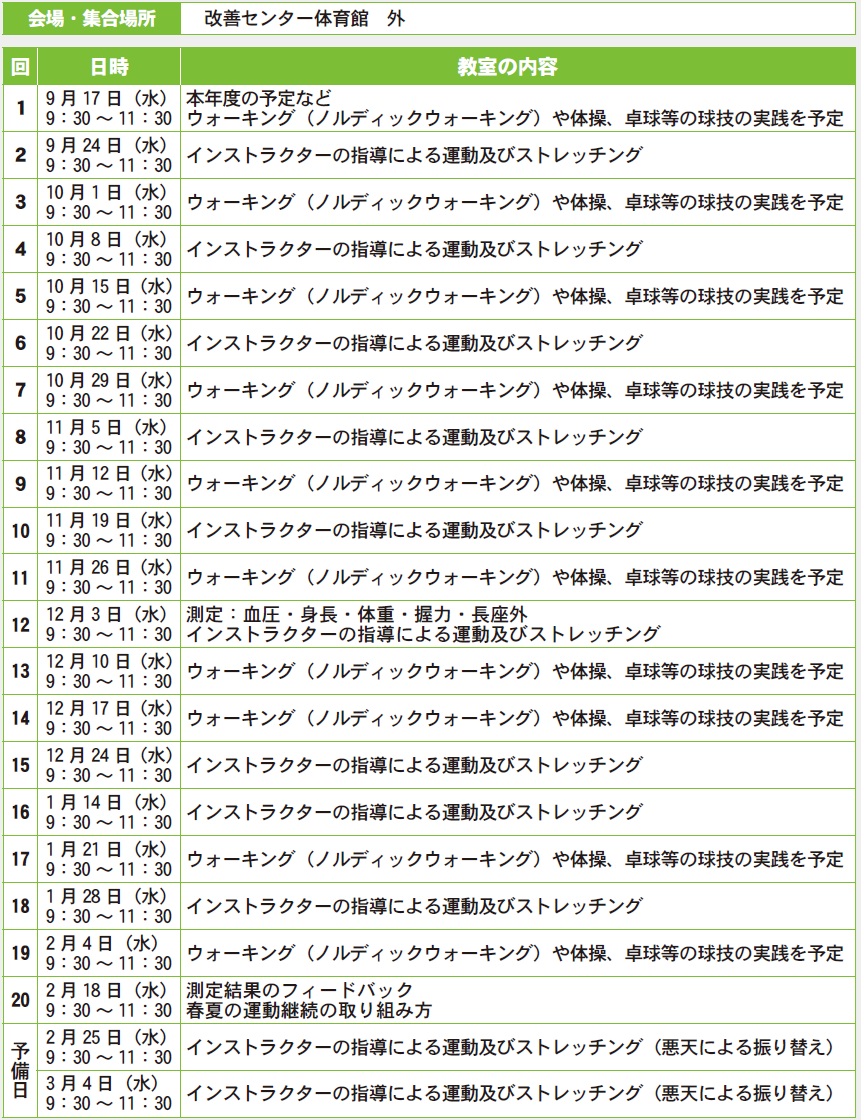 申し込み等:事前申し込み不要です。実施日時当日に改善センター体育館にお越しください。