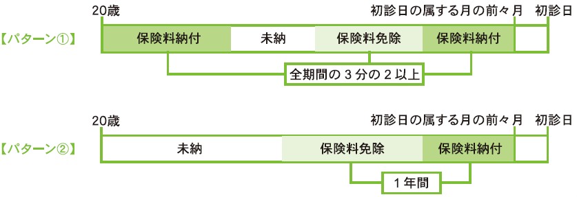 (1)初診日の属する月の前々月までの保険料納付済み期間(保険料免除期間等を含む)が、加入すべき期間の3分の2以上必要です。