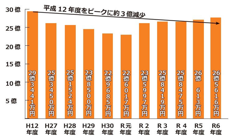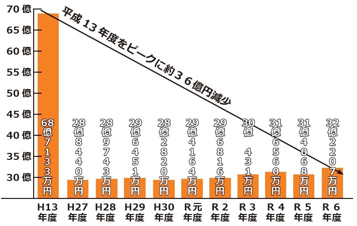 ピーク時だった平成13年(68億7,133万円)と比較すると約36億円減少しています。