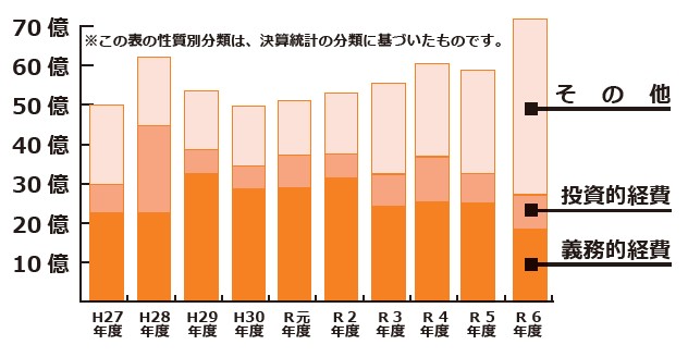 令和6年度の地方交付税額(普通交付税、特別交付税)は、26億5,616万円で昨年(26億613万円)より5,003万円増加しました。また、平成12年度が地方交付税額のピークの年(29億3,441万円)であり、比較すると約90.5%の水準となっております。