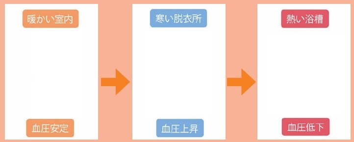 寒い室内で服を脱ぐことで、身体の表面温度が下がります。そうすると、人間は寒さに対応するために血圧が上昇します。急上昇した血圧は、お風呂のお湯に浸かることで血管が拡がり今度は血圧が急激に低下します。こうなることでヒートショックが起きます。