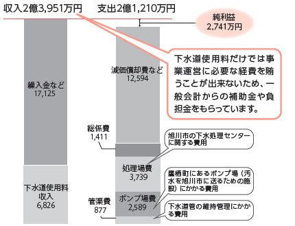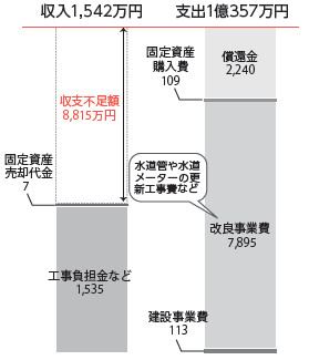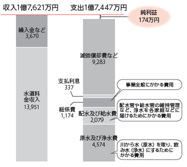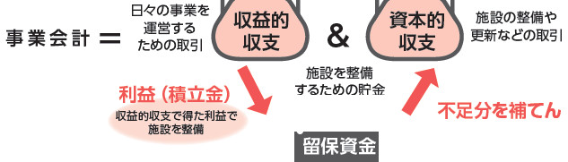 水道事業と公共下水道事業の会計は「収益的収支」と「資本的収支」に分かれており、「収益的収支」で得た利益を資金として、水道や下水道施設の整備を行うことが、事業経営の基本的な仕組みとなっています。