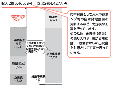 水道事業、公共下水道事業共に決算は黒字となりましたが、人口減少などによる収入の減少、物価高騰や工事費の上昇に伴う支出の増加が続くことが想定されます。将来にわたり安定した事業に取り組めるよう、引き続き経営の健全化に努めます。