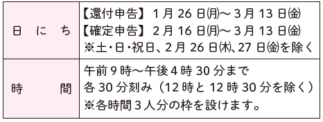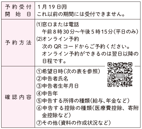 確定申告・住民税申告受付に際して、待ち時間の短縮やスムーズな受付のため、事前予約受付を導入しています。