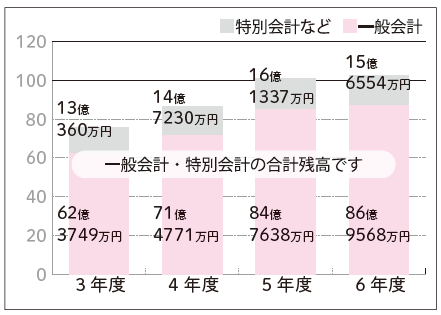 公共事業を推進するために借り入れた地方債の令和6年度末残高は、一般会計が86億9568万円、特別会計などが15億6554万円、合計102億6122万円となっており、前年度末より1億7147万円増加しています。
