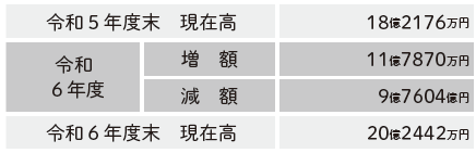 地方債の借入額と元利償還額の推移および地方債の残高の状況は次の表のとおりです。基金とは、将来直面する多様な財政需要などに対応するため、毎年積み立てられているものです。令和6年度末の現在高は、2億266万円増加し、20億2442万円となりました。