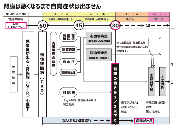 では、その腎臓は、どれくらい働きが悪くなると自覚症状が出てくるのでしょうか。