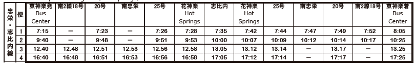 ※土曜、日曜、祝日は忠栄・志比内線のみ運行します。土曜、日曜、祝日は下記時刻で運行しますので、お間違えのないようにお願いします。