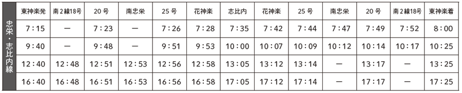 ※土曜、日曜、祝日は忠栄・志比内線のみ、次の[土曜、日曜、祝日]時刻表で運行しますので、お間違えのないようお願いします。