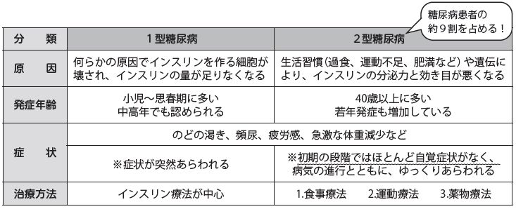 糖尿病とは、インスリン(血糖を下げる働きを持つホルモン)の作用不足や分泌不足によって、血液中のブドウ糖(血糖)が通常より増えてしまう病気です。糖尿病は、インスリンの作用不足が起きる原因により、大きく分けて「1型糖尿病」と「2型糖尿病」の2つに分類されています。