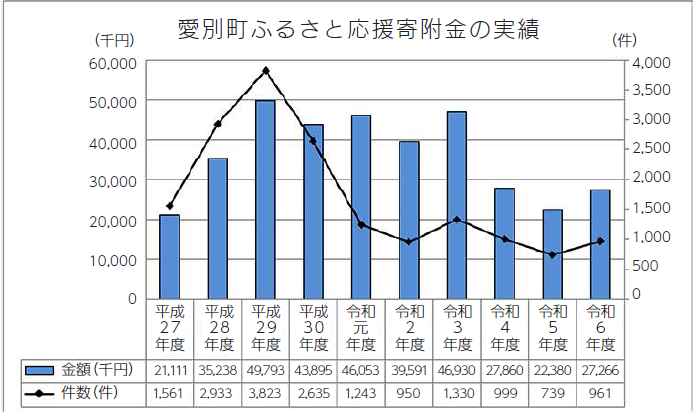 近年は、総務省が定める返礼品基準の厳格化等の影響により、寄附金額・件数が減少傾向にありますが、新たな返礼品の追加やSNSを活用したPRといった積極的な取り組みを行っています。