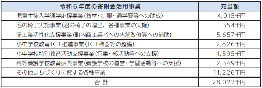 なお、今年度いただいた寄附金は、次年度以降に実施する健康・福祉・子育てや産業振興、教育・文化分野など、まちの重要な事業の貴重な財源として活用させていただきます。